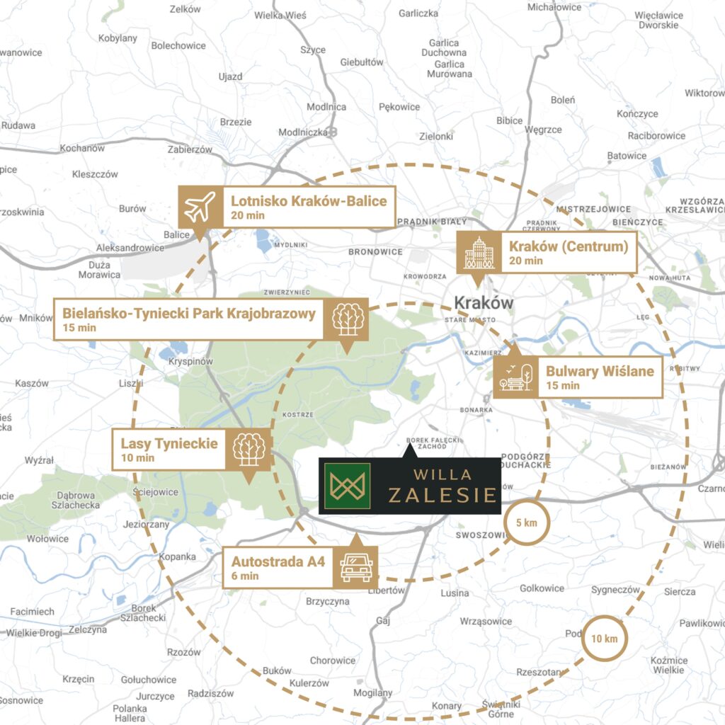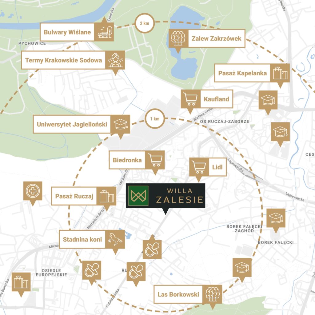 Willa Zalesie zlokalizowana jest przy ul. Kobierzyńskiej 145 w Krakowie – mieście, w którym historia i nowoczesność splatają się w wyjątkowy sposób. Tutaj niektóre ulice kryją swoje legendy, jednocześnie oferując bogate życie kulturalne, szeroką ofertę handlowo-usługową, a także mnóstwo rozrywek i świetnych lokali gastronomicznych oraz ciekawych terenów rekreacyjnych i zieleni.